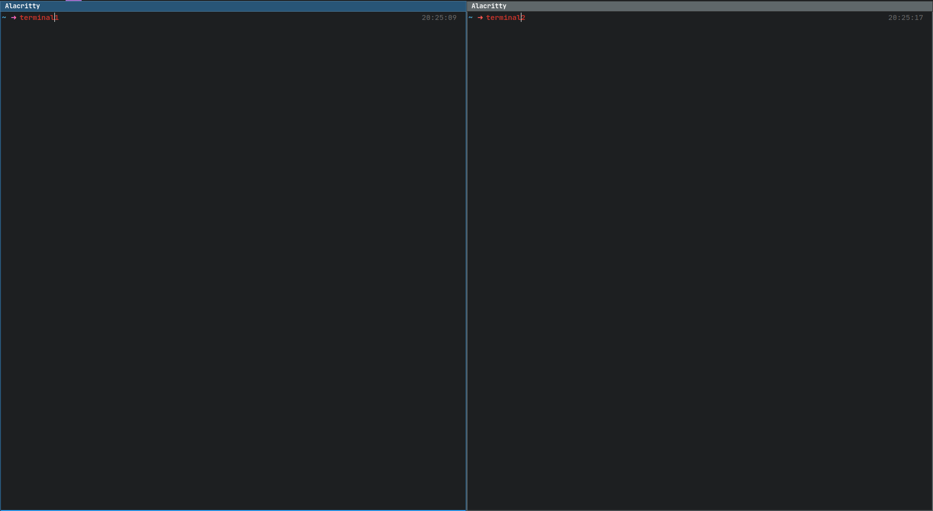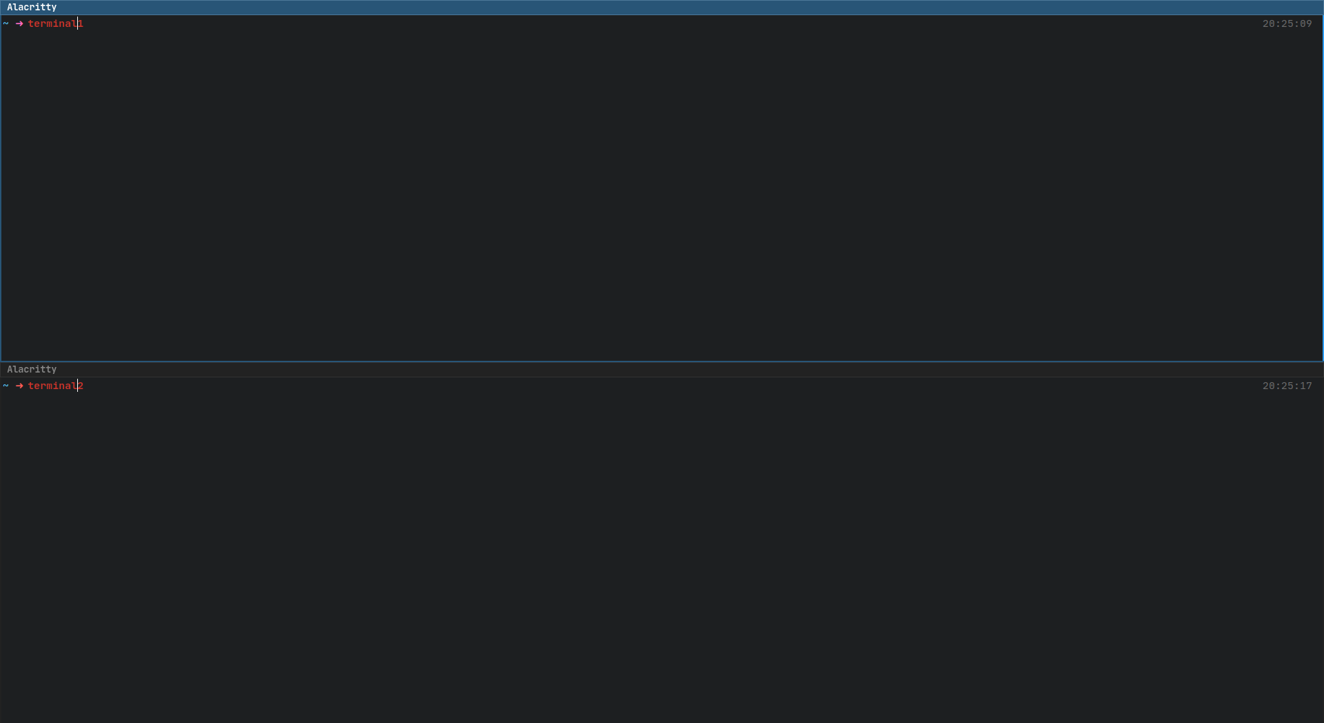 Above we have an example of when we start i3 with a single monitor, we have a single workspace and two terminal windows. The default layout for this workspace is called SPLITH. If you decide to change the layout to SPLIV (vertical) and open two terminals, you’ll end up with something like this: