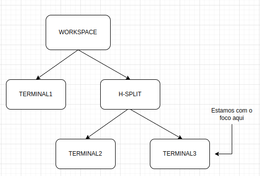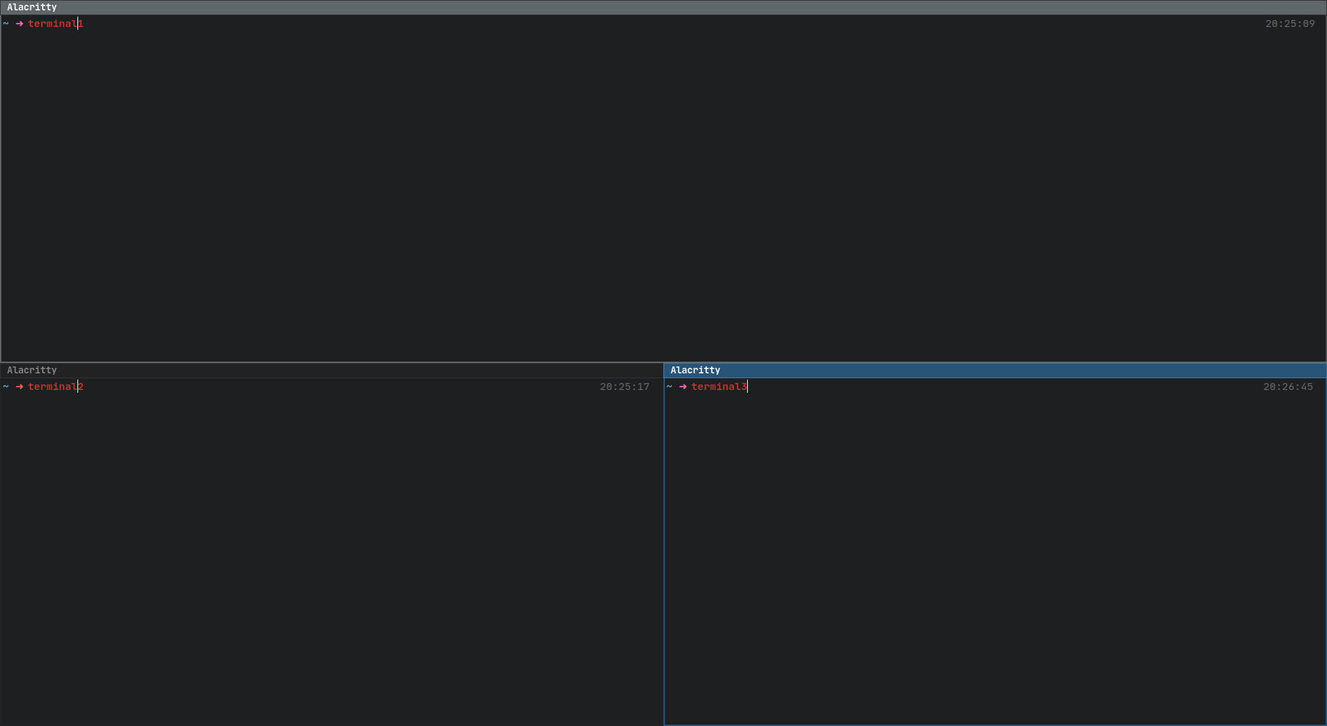To make it even more interesting, i3 allows splitting anything. Let’s say that in the previous example you want to open another terminal, but this time to the right of TERMINAL2. Simply put focus on the TERMINAL2 window and do SPLITH ($mod+H):