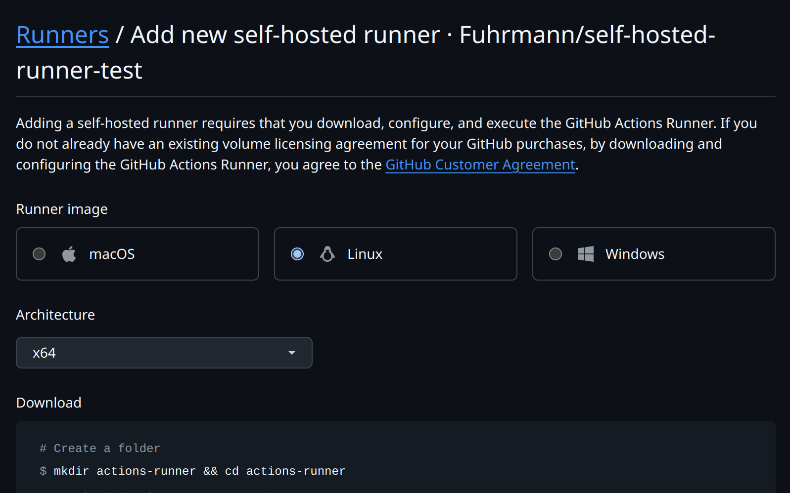 On the next screen, choose your operating system and follow the step-by-step instructions provided to download and configure the runner.