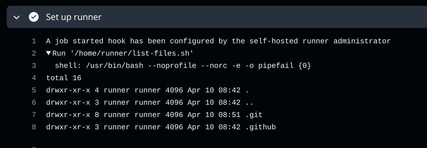 runner@runner-server:~/actions-runner$ echo "ACTIONS_RUNNER_HOOK_JOB_STARTED=/home/runner/list-files.sh" > .env